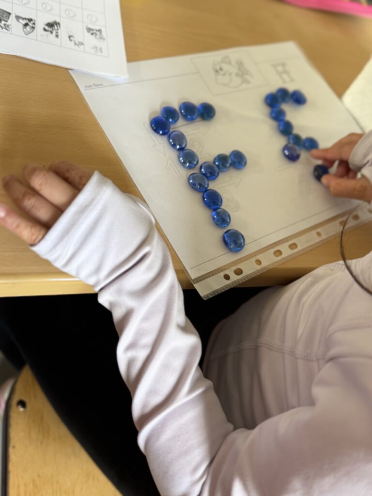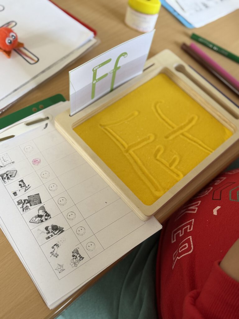 An den einzelnen Stationen konnten die Kinder den Buchstaben auf ganz unterschiedliche Weise entdecken und üben. So wurde das F zunächst bunt ausgemalt. An einer weiteren Station legten die Kinder den Buchstaben mit Glassteinen nach und trainierten dabei ihre Feinmotorik. Auch mit kleinen Holzwürfeln wurde das F gelegt, was viel Geschick und Konzentration erforderte. Besonders viel Freude hatten die Kinder an der Sandstation.