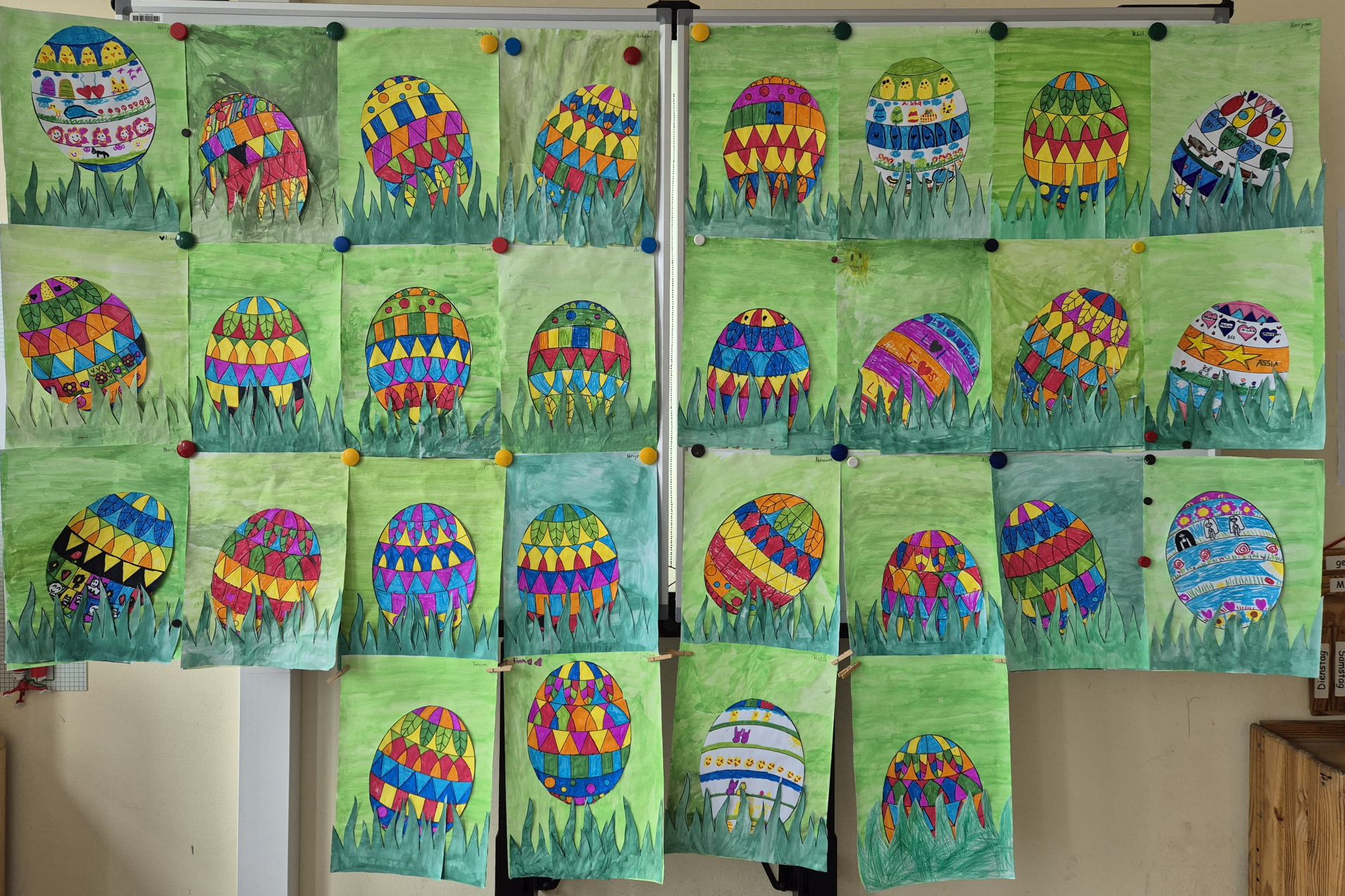 Der Frühling ist da! Im Kunstunterricht haben wir bunte Ostereier gestaltet. Zuerst haben wir den Hintergrund wie eine frühlingshafte Wiese